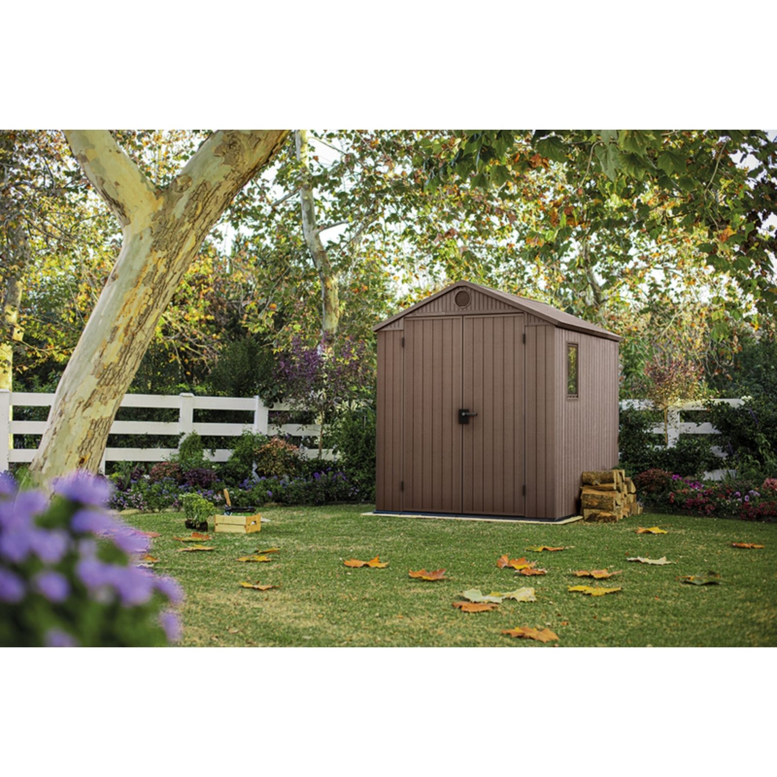 Zahvaljujući ventilaciji, sprječava se zadržavanje vlage unutar kućice, dok prozor i svjetlosni paneli obezbjeđuju prirodno osvjetljenje. Dupla vrata omogućavaju lak pristup i jednostavno rukovanje većim predmetima, a podna ploča štiti sadržaj od prljavštine i vode.