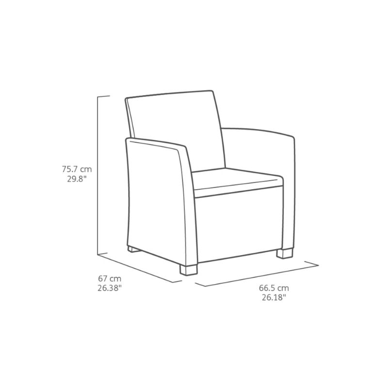 Mia Set s jastučnikom – Elegantna i praktična garnitura koja predstavlja neobičnu varijaciju vrtnog namještaja. Sastoji se od dvostruke sofe, dvije fotelje s jastucima i stola koji ujedno služi i kao kutija za odlaganje. Moderan dizajn, uzorak koji podsjeća na prirodni ratan i visoka kvaliteta izrade čine Mia set savršenim izborom za terase i baštenske prostore.