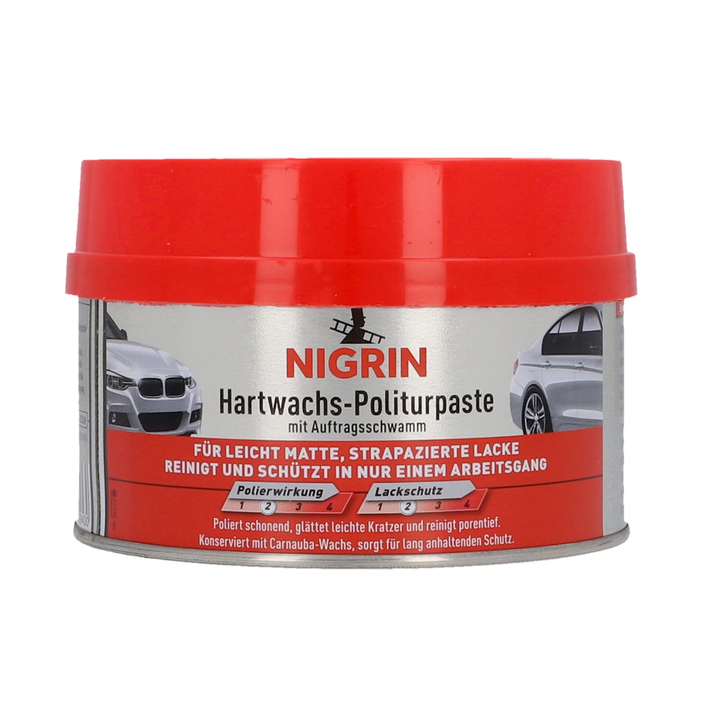 NIGRIN pasta za poliranje od tvrdog voska čisti sve blago mat, naglašene boje i metalik boje u samo jednom koraku. Udio visokokvalitetnog karnauba voska stvara dugotrajan pečat boje koji odbija vodu i prljavštinu. Konzistencija poput paste ne kaplje i ne teče tokom obrade i može se koristiti i na mokroj boji, što značajno smanjuje vaš trud za održavanje. NIGRIN pasta za poliranje od tvrdog voska osigurava trajno zadržavanje vrijednosti i sjajan izgled vašeg vozila jer čisti na posebno nježan način i vraća originalnu dubinu boje i sjaj boji. Pogodan je i za mašinsku obradu.